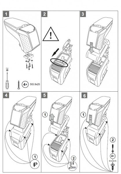 Opěrky jsou vyrobeny přesně na daný typ vozu. Montáž se provádí pomocí přiložených šroubů, přišroubováním ke středovému tunelu. Tělo opěrky je vyrobeno z velice odolného plastu s pevným kloubem. Horní otevírací část je potažena měkkou omyvatelnou koženkou. Vnitřní část je potažena flockem, nebo semišem.