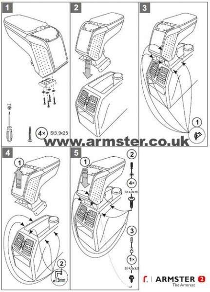 Opěrky jsou vyrobeny přesně na daný typ vozu. Montáž se provádí pomocí přiložených šroubů, přišroubováním ke středovému tunelu. Tělo opěrky je vyrobeno z velice odolného plastu s pevným kloubem. Horní otevírací část je potažena měkkou omyvatelnou koženkou. Vnitřní část je potažena flockem, nebo semišem.