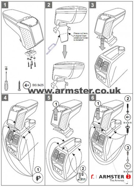 Opěrky jsou vyrobeny přesně na daný typ vozu. Montáž se provádí pomocí přiložených šroubů, přišroubováním ke středovému tunelu. Tělo opěrky je vyrobeno z velice odolného plastu s pevným kloubem. Horní otevírací část je potažena měkkou omyvatelnou koženkou. Vnitřní část je potažena flockem, nebo semišem.