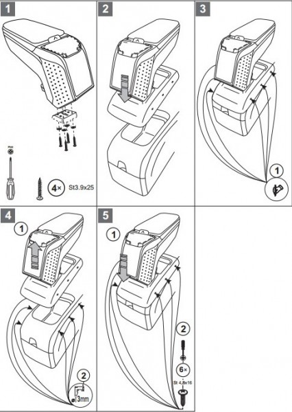 Opěrky jsou vyrobeny přesně na daný typ vozu. Montáž se provádí pomocí přiložených šroubů, přišroubováním ke středovému tunelu. Tělo opěrky je vyrobeno z velice odolného plastu s pevným kloubem. Horní otevírací část je potažena měkkou omyvatelnou koženkou. Vnitřní část je potažena flockem, nebo semišem.