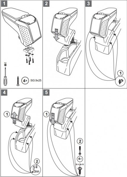 Opěrky jsou vyrobeny přesně na daný typ vozu. Montáž se provádí pomocí přiložených šroubů, přišroubováním ke středovému tunelu. Tělo opěrky je vyrobeno z velice odolného plastu s pevným kloubem. Horní otevírací část je potažena měkkou omyvatelnou koženkou. Vnitřní část je potažena flockem, nebo semišem.