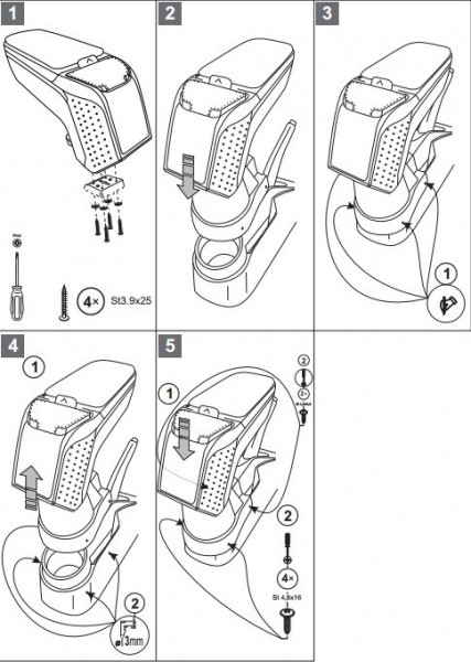 Opěrky jsou vyrobeny přesně na daný typ vozu. Montáž se provádí pomocí přiložených šroubů, přišroubováním ke středovému tunelu. Tělo opěrky je vyrobeno z velice odolného plastu s pevným kloubem. Horní otevírací část je potažena měkkou omyvatelnou koženkou. Vnitřní část je potažena flockem, nebo semišem.