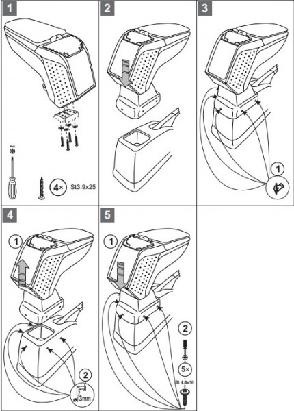 Opěrky jsou vyrobeny přesně na daný typ vozu. Montáž se provádí pomocí přiložených šroubů, přišroubováním ke středovému tunelu. Tělo opěrky je vyrobeno z velice odolného plastu s pevným kloubem. Horní otevírací část je potažena měkkou omyvatelnou koženkou. Vnitřní část je potažena flockem, nebo semišem.