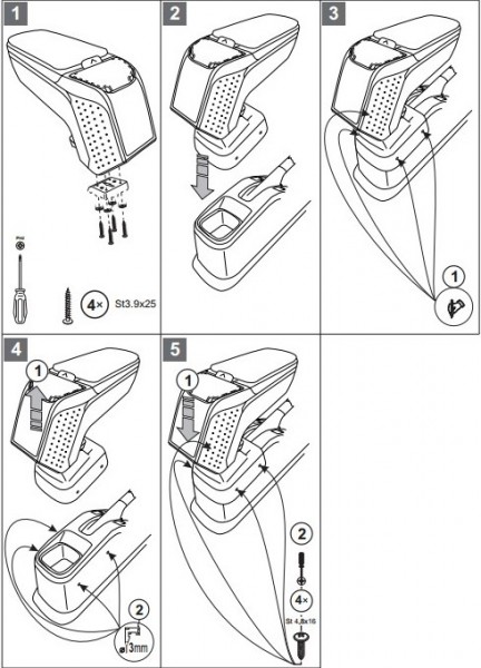 Opěrky jsou vyrobeny přesně na daný typ vozu. Montáž se provádí pomocí přiložených šroubů, přišroubováním ke středovému tunelu. Tělo opěrky je vyrobeno z velice odolného plastu s pevným kloubem. Horní otevírací část je potažena měkkou omyvatelnou koženkou. Vnitřní část je potažena flockem, nebo semišem.