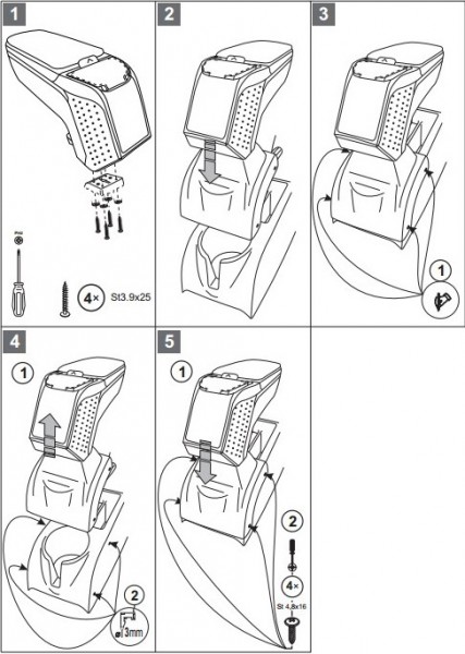 Opěrky jsou vyrobeny přesně na daný typ vozu. Montáž se provádí pomocí přiložených šroubů, přišroubováním ke středovému tunelu. Tělo opěrky je vyrobeno z velice odolného plastu s pevným kloubem. Horní otevírací část je potažena měkkou omyvatelnou koženkou. Vnitřní část je potažena flockem, nebo semišem.