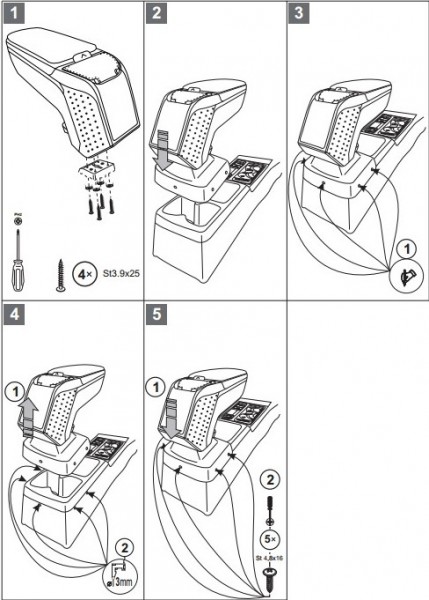 Opěrky jsou vyrobeny přesně na daný typ vozu. Montáž se provádí pomocí přiložených šroubů, přišroubováním ke středovému tunelu. Tělo opěrky je vyrobeno z velice odolného plastu s pevným kloubem. Horní otevírací část je potažena měkkou omyvatelnou koženkou. Vnitřní část je potažena flockem, nebo semišem.