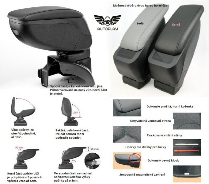 Loketní opěrky LUX mají ve svém těle velký úložný prostor s vestavěným mincovníkem. Oproti běžné opěrce standart mají horní část na kolejnici, což umožňuje posun horní části blíže k řadící páce. Na víc opěrky LUX mají kolečko (doraz) možnosti nastavení výšky. Drtivá většina opěrek LUX se dá sklopit celou horní částí, mezi opěradla předních sedadel. Zavírání opěrky je magnetické, tedy nehrozí žádné odlomení záklapky, jako u levných opěrek. Opěrky jsou vyrobeny přesně na daný typ vozu. Montáž se provádí pomocí přiložených šroubů, přišroubováním ke středovému tunelu. Tělo opěrky je vyrobeno z velice odolného plastu s pevným kloubem. Horní otevírací část je potažena měkkou omyvatelnou koženkou. Vnitřní část je potažena flockem, nebo semišem. Velmi jednoduchá montáž. Horní část je nabízena ve dvou barvách a to v černé, nebo šedé. Video: http://www.youtube.com/watch?v=navbiWhsuog&feature=player_embedded