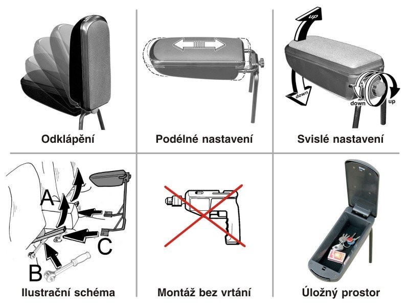 + jednoduchá montáž bez vrtání, připevněno na vodících lištách sedadel