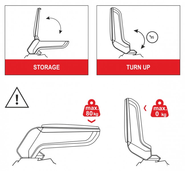 Opěrky disponují úložným prostorem, který slouží k ukládání osobních věcí řidiče a spolucestujících. Vnitřek úložného prostoru je flokován měkkým semišovým materiálem a otevírá se za pomocí tlačítka. Celá horní část včetně úložného prostoru lze odklopit do svislé polohy.