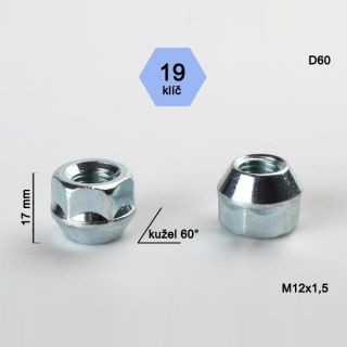 Kolová matice s krátkou hlavou M12x1,5, dosedací plocha kužel 60°, délka závitu 17 mm, pevnostní matice určená k uchycení rozšiřovacích podložek nebo ALU disků k automobilu.