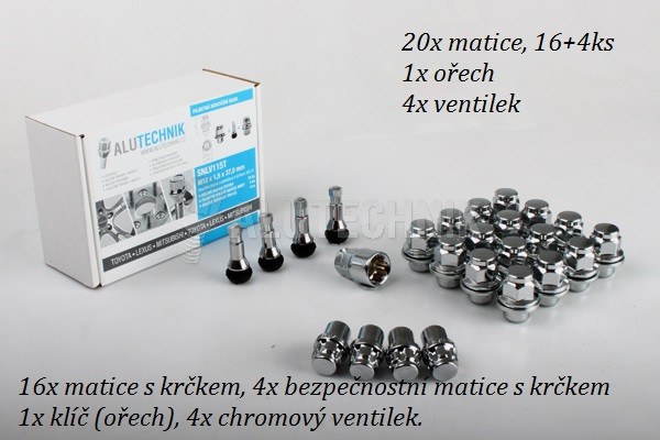 Obsahuje 16ks běžných matic s krčkem, 4ks pojistných matic proti krádeži kol, 1ks ořech, 4ks gumových kolových ventilů s chromovou krytkou a bavlněný sáček na uložení sady do kufru automobilu.