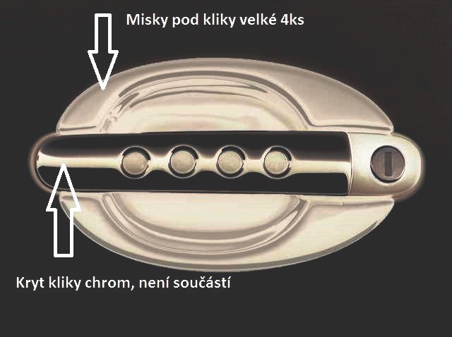 Skoncujte s nehezkými škrábanci pod klikami dveří Vašeho vozu. Čtyřdílná sada krytů pod kliky je vyrobena z ABS - stříbrný matný. Montáž je velice jednoduchá - připevnění je realizováno pomocí speciální vysoceadhezivní oboustranné pěnové samolepící lepenky.