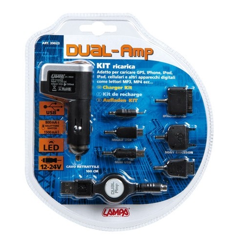 Nabíječka do auta od italské firmy LAMPA Italy s 6 různými adaptéry pro Nokia, Mini USB, Micro USB, USB, Samsung, Sony Ericsson, Iphone, IPAD.