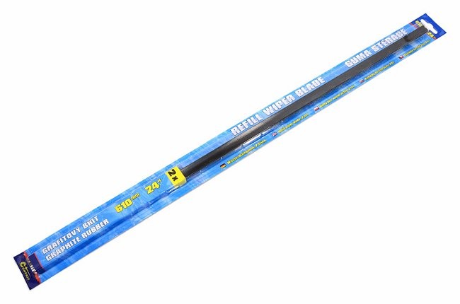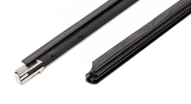 Sada 2 ks náhradních pryžových vložek (gumiček) v plastové liště, která se vsazuje po vysunutí staré gumičky do úchytů kovového stěrače. Při použití na kratší stěrače lze gumičku zkrátit nožem. Délka 610 mm, materiál grafit + PVC lišta. Lišta má z jedné strany zámek pro zábranění vysunutí lišty ze stěrače.