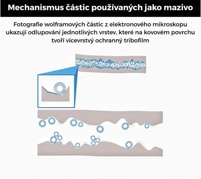 Částice jsou kulaté a skládají se z několika desítek vrstev. Za působení tlaku a smyku se jednotlivé vrstvy oddělují a na kluzných plochách vytváří wolframový nano povlak. Ten výrazně zvyšuje odolnost kluzných ploch proti opotřebeni a snižuje tření.