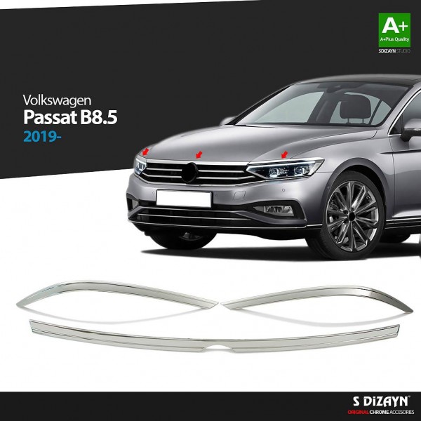 Nerez - chrom sada (3 ks) dekoračních rámečků kolem předních světel a středové lišty pro Volkswagen Passat B8, r.v. 2015-2023