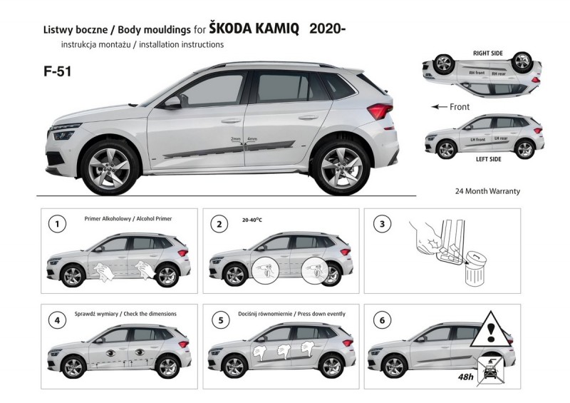 Cena za sadu 4ks bočních lišt. Materiál, velice lehký polyuretan, který z vnitřní strany obsahuje oboustranou lepící pásku 3M pro montáž nalepením. Lišty neobsahují kovové výstuhy, takže nedochází ke korozi. Jednoduchá montáž nalepením. Dokonalá ochrana proti poškrábání dveří a důlků při stání na parkovištích apd.