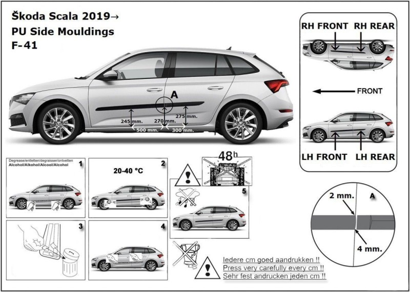 Odtrhněte z lišty barevné ochranné pásky, přiložte na naměřené body a lepte od hrany dveří pod středovým sloupkem směrem k nárazníkům. Po nalepní dokonale lištu přitiskněte rukou po celé ploše ať se ujistíte, že lišta je dobře přilepená ve všech místech.