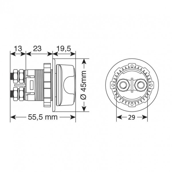 3 - polohový Ext-11 12/32V od známé italské firmy Lampa. Odpojovač baterie přerušuje hlavní elektrický obvod působením na kladný pól baterie.
