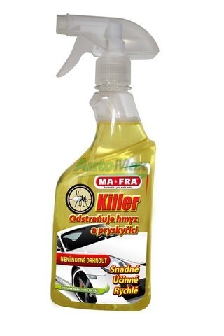Přípravek k rychlému a dokonalému odstranění zbytků hmyzu a pryskyřice z karoserie a skel vozů, motocyklů, kamionů a přívěsů. Díky svému vyváženému složení KILLER rozpouští a odstraňuje houževnaté nečistoty bez námahy a poškození ošetřovaných míst. Stačí jen nastříkat, nechat cca 60s působit a opláchnout vodou. Velice aktivně působící. Je dodáván v rozprašovači 500ml.