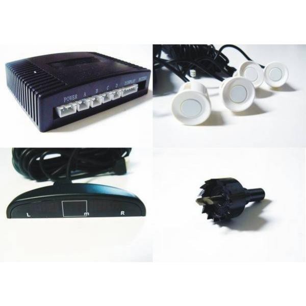 Komplet: 4x ultrazvukový senzor - bílý. LED displej s číselným údajem o vzdálenosti a akustickou signalizací kompletní kabeláž vykružovák na vyříznutí přesného otvoru do nárazníku návod k montáži a použití