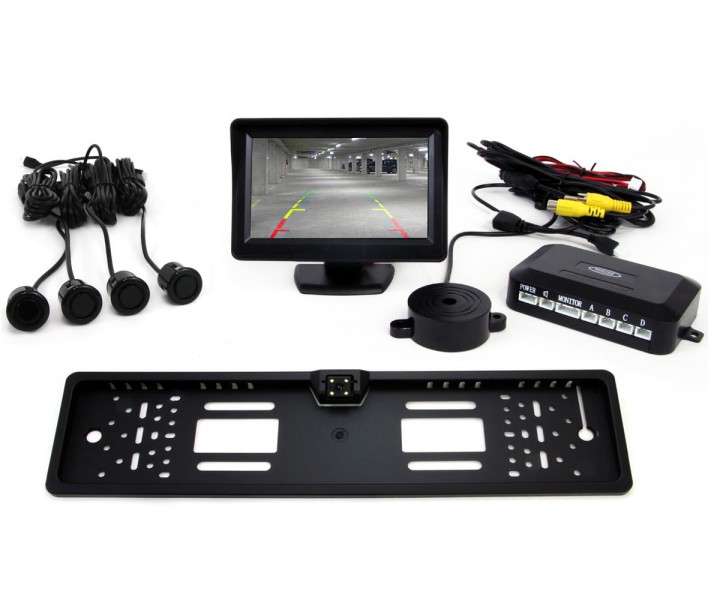 Parkovací asistent s 4ks černými Gold senzory, pípákem a TFT displeje a kamerou umístěnou v držáku registrační značky.
