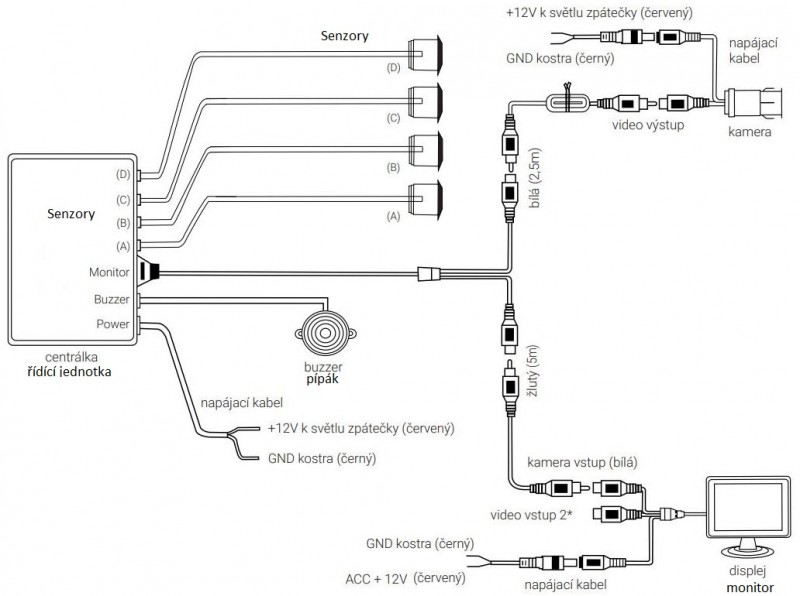 Řídící jednotka je vlastně centrálka do které přivedete od všeho kabely a zároveň je napájena 12V, kde plus vezmeme od kabelu plus couvací žárovky a mínus z kostry vozu, nebo z mínus kabelu.