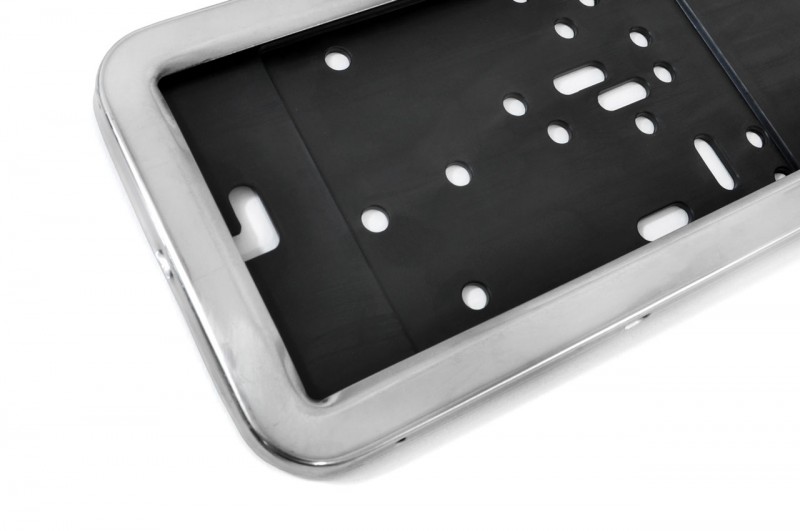 Plastová podložka orámovaná nerezovým leštěným rámečkem sloužící jako držák registrační značky. (SPZ) Rámeček je proti ztrátě pojištěn mini šroubky k plastovému podkladu z boku podložky.