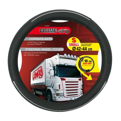 Univerzální potah na volant určen pro nákladní vozidla od italské firmy Lampa s decentním chromovým páskem.