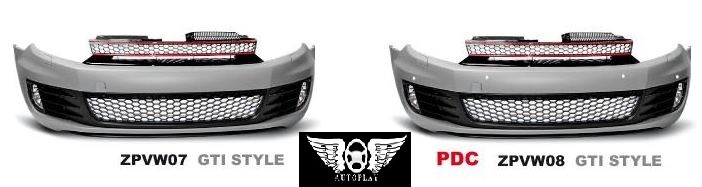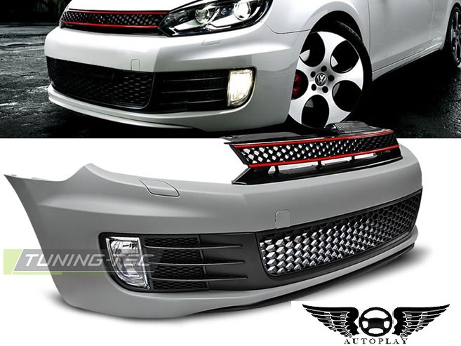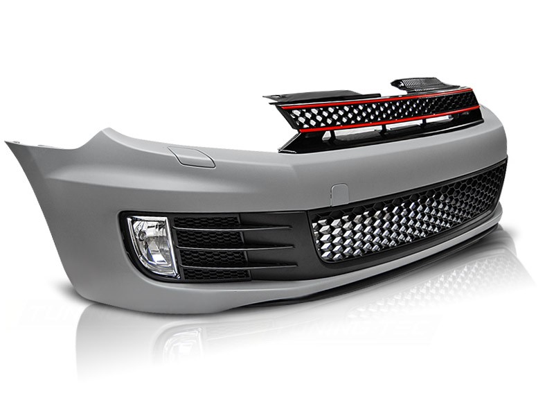 Přední nárazník VW Golf 6 ve stylu GTI. Nárazník je vyroben s ABS plastu a je možné jej lakovat. K nárazníku patří zdarma v ceně: záslepky ostřikovačů světel, záslepka tažného oka, přední maska s mřížkou bez znaku, mlhové světlomety, držáky mlhovek s žebrováním, spodní mřížka a záslepka kapoty po výřezu pro znak. Tento nárazník nemá otvory pro parkovací přední senzory.