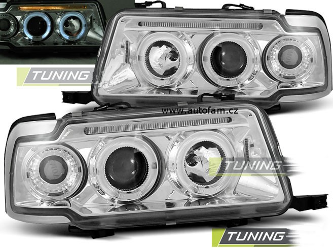 Cena za 2ks – pár. Přední světla, okořeněna o takzvané andělské kroužky, svítící okolo parabol a sloužící jako parkovací světlo. Efekt rozsvícených očí. Vše plně homologováno pro provoz na veřejných komunikacích. Dopřejte svému vozu neobyčejný nový design pouhým přehozením za seriové světla. Podpora elektrického naklápění světel. 2x svítící kroužek v každém světle. Žárovky H1 + H1, parkovací = kroužky, blinkr = 21W.