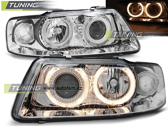 Cena za 2ks – pár. Přední světla, okořeněna o takzvané andělské kroužky, svítící okolo parabol a sloužící jako parkovací světlo. Efekt rozsvícených očí. Vše plně homologováno pro provoz na veřejných komunikacích. Dopřejte svému vozu neobyčejný nový design pouhým přehozením za seriové světla. Podpora elektrického naklápění světel. 2x svítící kroužek v každém světle. Pro žárovky H7 + H7, parkovací = kroužky, blinkr = 21W.