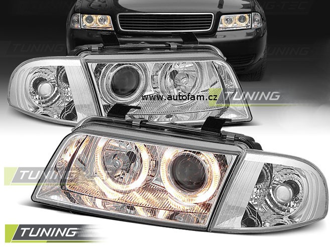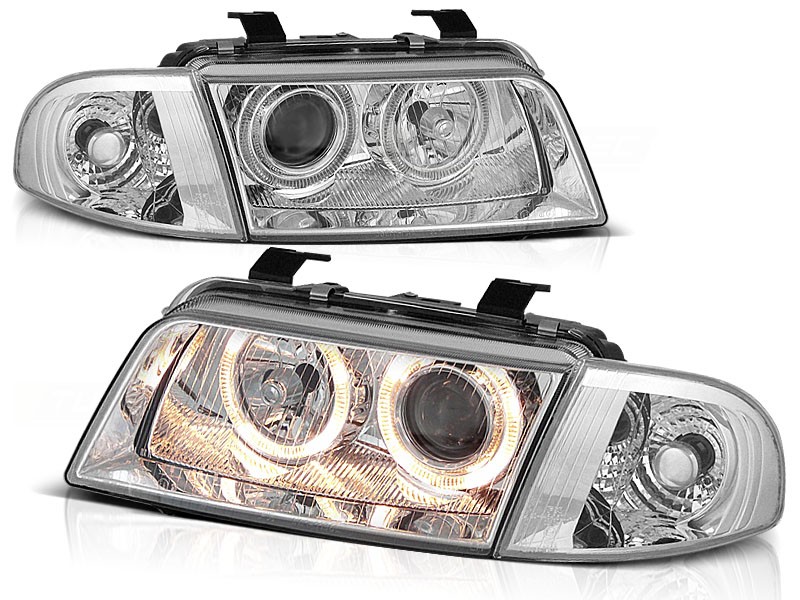 Cena za 2ks – pár. Přední světla, okořeněna o takzvané andělské kroužky, svítící okolo parabol a sloužící jako parkovací světlo. Efekt rozsvícených očí. Vše plně homologováno pro provoz na veřejných komunikacích. Dopřejte svému vozu neobyčejný nový design pouhým přehozením za seriové světla. Podpora elektrického naklápění světel. 2x svítící kroužek v každém světle. Světla mají oddělené blinkry, které jsou v ceně. Žárovky H7 + H7 v ceně. Blinkr 21W, parkovací = kroužky.