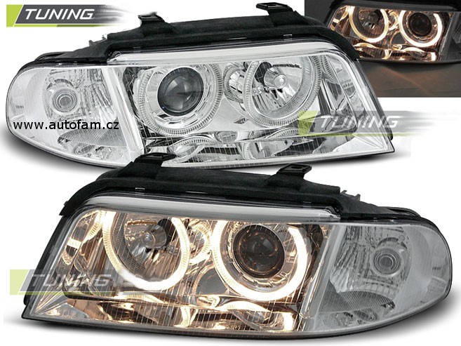 Cena za 2ks – pár. Přední světla, okořeněna o takzvané andělské kroužky, svítící okolo parabol a sloužící jako parkovací světlo. Efekt rozsvícených očí. Vše plně homologováno pro provoz na veřejných komunikacích. Dopřejte svému vozu neobyčejný nový design pouhým přehozením za seriové světla. Podpora elektrického naklápění světel. 2x svítící kroužek v každém světle. Pro žárovky H7 + H7. Parkovací = kroužky, blinkr = 21W.