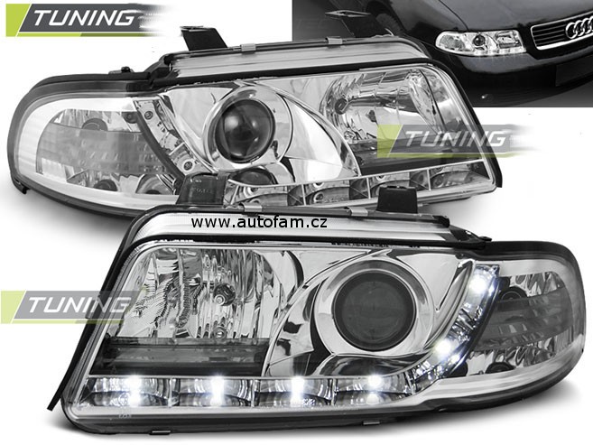 Cena za 2ks – pár. Daylight, to je originalita a styl pro Váš vůz. Lampy inspirovány vzhledem nejnovější řady vozidel s ledkovým osvětlením ozvláštní Váš vůz a dodají mu agresivní vzhled. Vše je připraveno tak, aby světlomety přesně pasovaly na místo původních. To vše v nejvyšší možné kvalitě s homologací pro provoz na veřejných komunikacích. Podpora elektrického naklápění. 8x led v každém led pásu. Pro žárovky H1 + H1, parkovací = LED, blinkr = 21W. H1 v ceně.