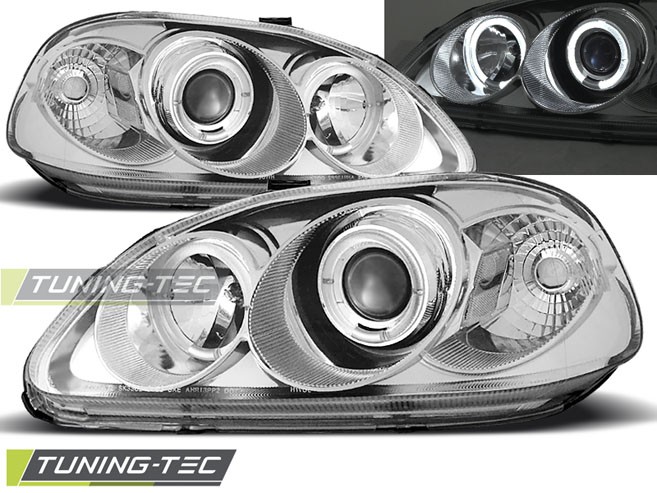 Cena za 2ks – pár. Přední světla, okořeněna o takzvané andělské kroužky, svítící okolo parabol a sloužící jako parkovací světlo. Efekt rozsvícených očí.