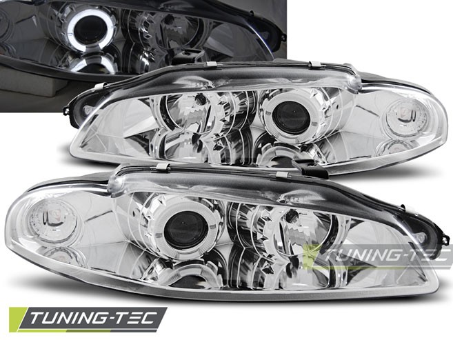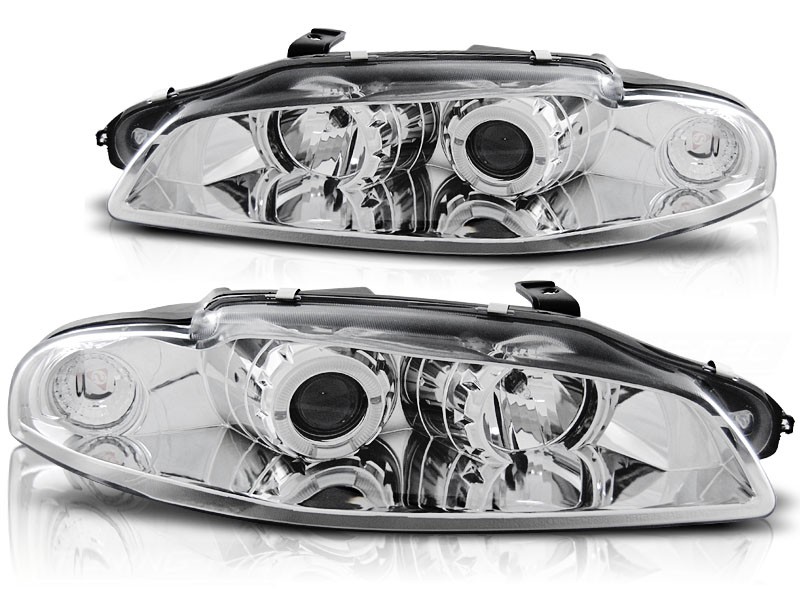 Cena za 2ks – pár. Přední světla, okořeněna o takzvané andělské kroužky, svítící okolo parabol a sloužící jako parkovací světlo. Efekt rozsvícených očí. Určeno pro vývoz do USA, nemají homologační E. Dopřejte svému vozu neobyčejný nový design pouhým přehozením za seriové světla. Manuální naklánění sklonu světel. 1x svítící kroužek v každém světle. Žárovky H1 tlumené. + H1 dálkové (H1v ceně). Parkovací = kroužky.
