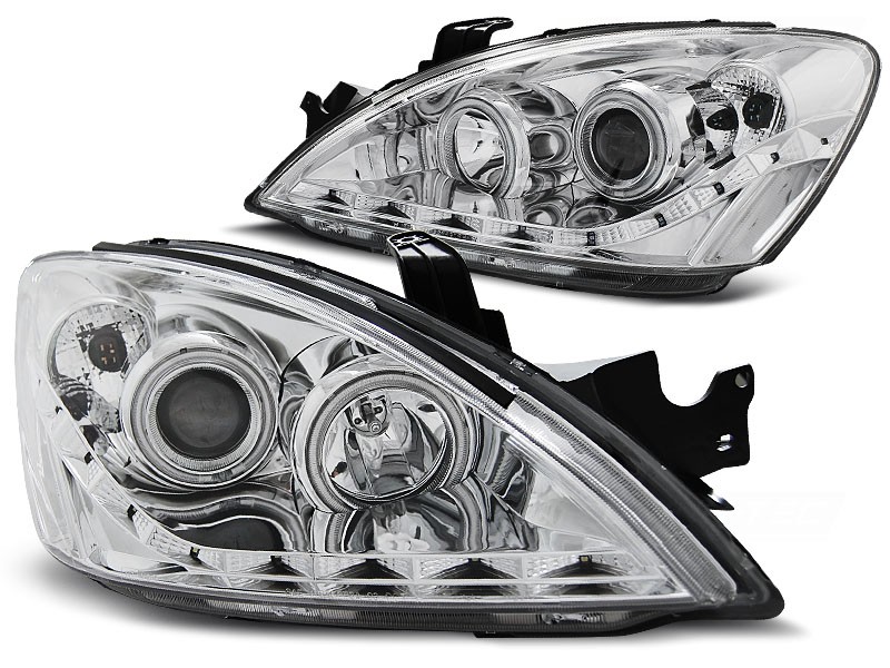 Cena za 2ks – pár. Přední světla, okořeněna o takzvané andělské kroužky, svítící okolo parabol a sloužící jako parkovací světlo. Efekt rozsvícených očí. Na víc LED pás 9xled jako poziční světlo. Dopřejte svému vozu neobyčejný nový design pouhým přehozením za seriové světla. Určeno pro trh do USA, nemá evropskou homologaci. Manuální naklápění sklonu světel. 2 x svítící kroužek v každém světle, system CCFL (jasnější bílé světlo) + LED. Žárovky H7 tlumené + H1 dálková (v ceně.) Parkovací = kroužky, nebo LED Blinkr - 21W.