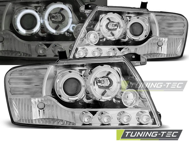 Cena za 2ks – pár. Přední světla, okořeněna o takzvané andělské kroužky, svítící okolo parabol a sloužící jako parkovací světlo. Efekt rozsvícených očí. Určeno pro vývoz do USA, nemají homologační E. Dopřejte svému vozu neobyčejný nový design pouhým přehozením za seriové světla. Manuální naklánění sklonu světel. 2x svítící kroužek v každém světle. Žárovky H7 tlumené. + H1 dálkové (H1v ceně). Parkovací = kroužky.