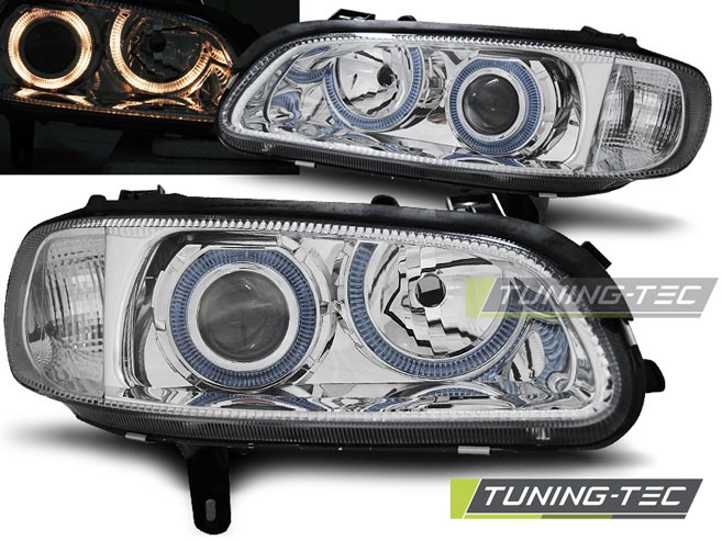 Cena za 2ks – pár. Přední světla, okořeněna o takzvané andělské kroužky, svítící okolo parabol a sloužící jako parkovací světlo. Efekt rozsvícených očí. Vše plně homologováno pro provoz na veřejných komunikacích. Dopřejte svému vozu neobyčejný nový design pouhým přehozením za seriové světla. Podpora elektrického naklápění světel. 2 x svítící kroužek v každém světle. Žárovky H1 + H7. Parkovací = kroužky. Blinkr - 21W.