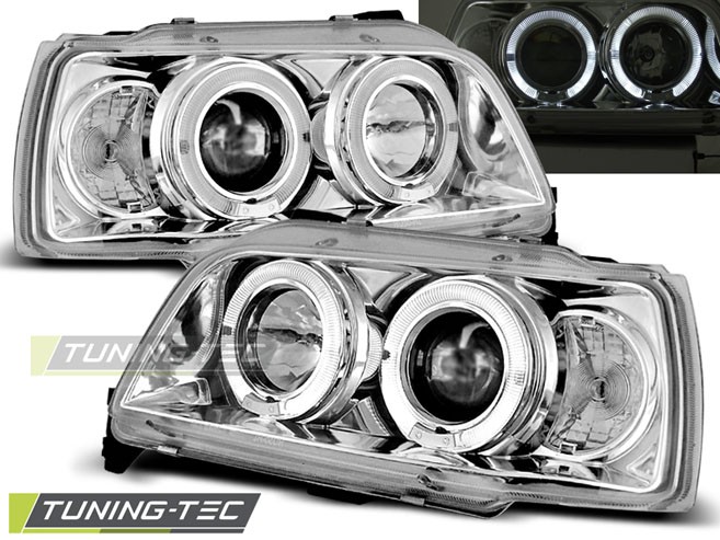Cena za 2ks – pár. Přední světla, okořeněna o takzvané andělské kroužky, svítící okolo parabol a sloužící jako parkovací světlo. Efekt rozsvícených očí. Vše plně homologováno pro provoz na veřejných komunikacích. Dopřejte svému vozu neobyčejný nový design pouhým přehozením za seriové světla. Manuální naklápění světel. 2 x svítící kroužek v každém světle. Žárovky H1 + H1 v ceně. Parkovací = kroužky. Blinkr - 21W.