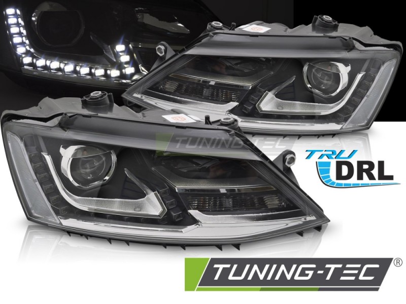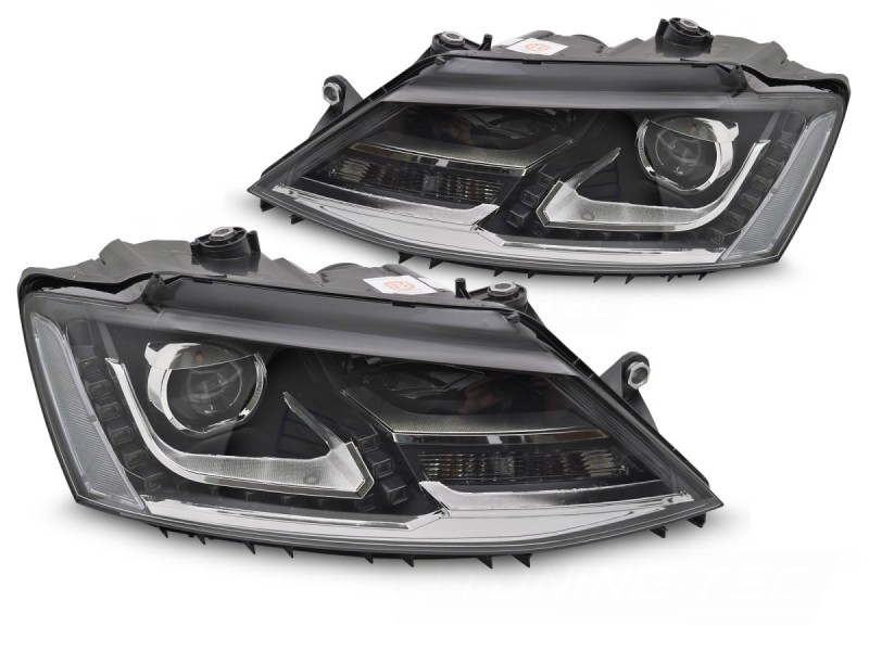 Projektorové přední světlomety s denním svícením (DRL) – moderní náhrada originálních halogenových světlometů pro Volkswagen Jetta VI. Projektorový systém Hi-Low zajišťuje lepší světelný kužel a výraznější vzhled přední části vozu.