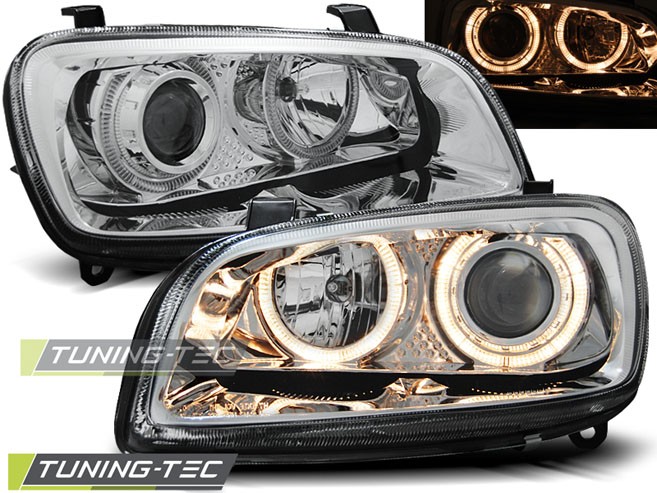 Cena za 2ks – pár. Přední světla, okořeněna o takzvané andělské kroužky, svítící okolo parabol a sloužící jako parkovací světlo. Efekt rozsvícených očí. Dopřejte svému vozu neobyčejný nový design pouhým přehozením za seriové světla.Vše plně homologováno pro provoz na veřejných komunikacích. Podpora elektrického naklápění světel. 2 x svítící kroužek v každém světle + diody.. Žárovky H7 + H1dálková ( H1 v ceně.) Parkovací = kroužky.