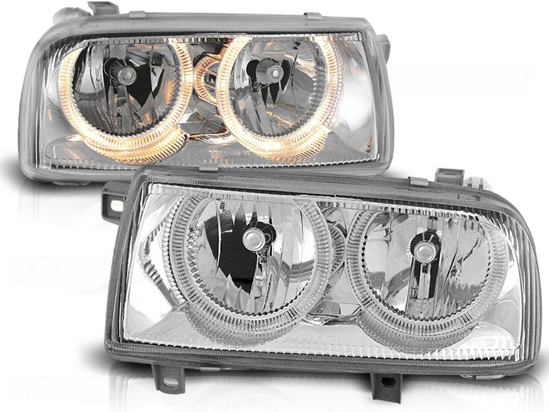 Cena za 2ks – pár. Přední světla, okořeněna o takzvané andělské kroužky, svítící okolo parabol a sloužící jako parkovací světlo. Efekt rozsvícených očí. Dopřejte svému vozu neobyčejný nový design pouhým přehozením za seriové světla. Vše plně homologováno pro provoz na veřejných komunikacích. Podpora elektrického naklápění světel. 2 x svítící kroužek v každém světle. Pro žárovky H7 tlumené + H7 dálkové. Parkovací = kroužky.