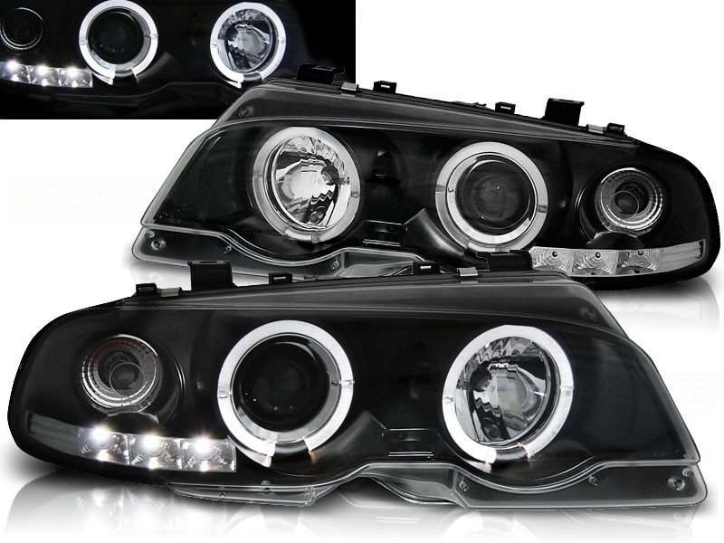 Cena za 2ks – pár. Přední světla, okořeněna o takzvané andělské kroužky, svítící okolo parabol a sloužící jako parkovací světlo. Efekt rozsvícených očí.