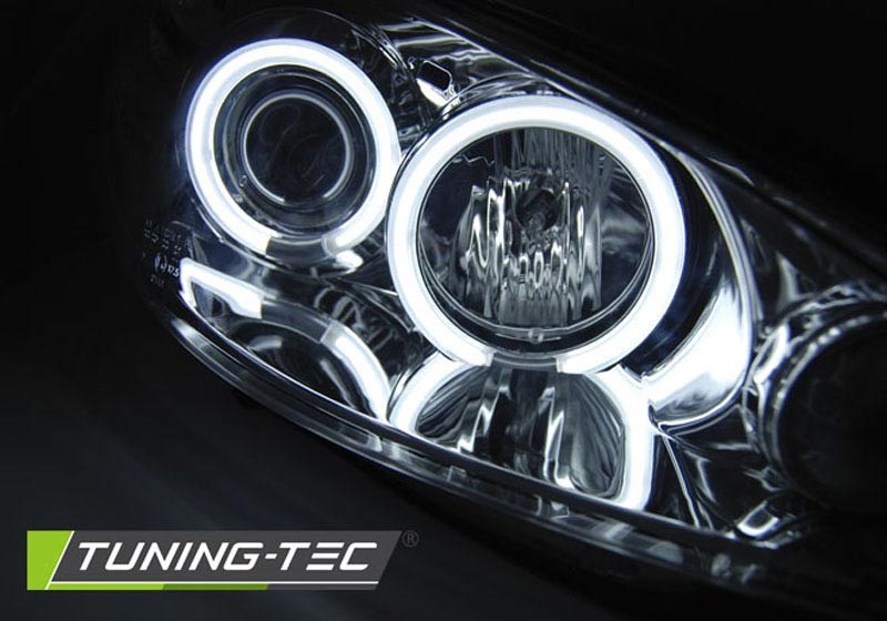 Přední světla, okořeněna o takzvané andělské kroužky CCFL, svítící okolo parabol a sloužící jako parkovací světlo. Efekt rozsvícených očí. Vše plně homologováno pro provoz na veřejných komunikacích. Homologace E vyražena přímo na světlech. Dopřejte svému vozu neobyčejný nový design pouhým přehozením za seriové světla.