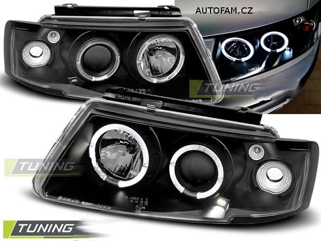 Cena za 2ks – pár. Přední světla, okořeněna o takzvané andělské kroužky, svítící okolo parabol a sloužící jako parkovací světlo. Efekt rozsvícených očí. Dopřejte svému vozu neobyčejný nový design pouhým přehozením za seriové světla. Vše plně homologováno pro provoz na veřejných komunikacích. Podpora elektrického naklápění světel. 2 x svítící kroužek v každém světle. Pro žárovky H1 tlumené + H1 dálkové v ceně. Parkovací = kroužky. Blinkr - 21W.