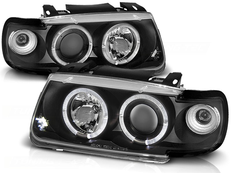 Cena za 2ks – pár. Přední světla, okořeněna o takzvané andělské kroužky, svítící okolo parabol a sloužící jako parkovací světlo. Efekt rozsvícených očí. Dopřejte svému vozu neobyčejný nový design pouhým přehozením za seriové světla. Vše plně homologováno pro provoz na veřejných komunikacích. Manuální naklápění světel. 2 x svítící kroužek v každém světle. Pro žárovky H1 tlumené + H1 dálkové v ceně. Parkovací = kroužky. Blinkr - 21W.