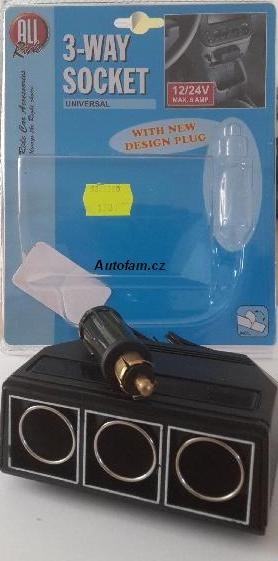 Roztrojka do autozásuvky s kabelem a zástrčkou do autozásuvky 12V. Roztrojka má kabel cca 80cm délky. Rozměr roztrojky cca délka 10,4cm, výška 4,8cm, šířka (hloubka) 7cm. Ze spod je násuvný držák, který lze připevnit na šrouby, nebo přiloženou oboustranně lepící páskou a na něho se roztrojka nasadí. Určeno pro 12-24V, max 6 Amp.
