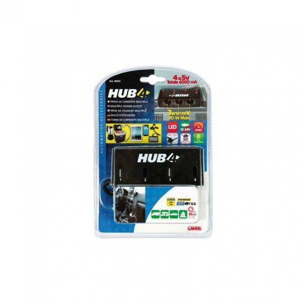 Roztrojka 12/24V má 3 zásuvky max. 90W a 4 porty USB celkem 6A. USB zásuvky kombinují 2 různé nabíjecí protokoly A a S, které zajistí kompatibilitu s většinou tabletů, smartphonů, gps, mp3, atd. Délka kabelu 85 cm.